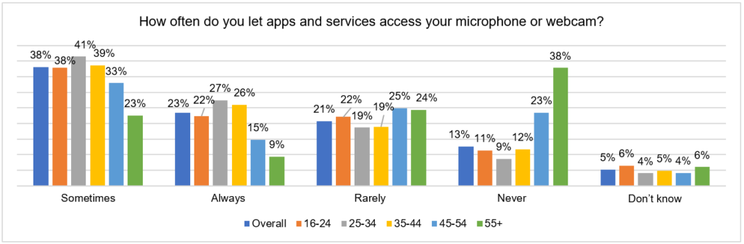 Allowing microphone or webcam access in apps and services, by age breakdown