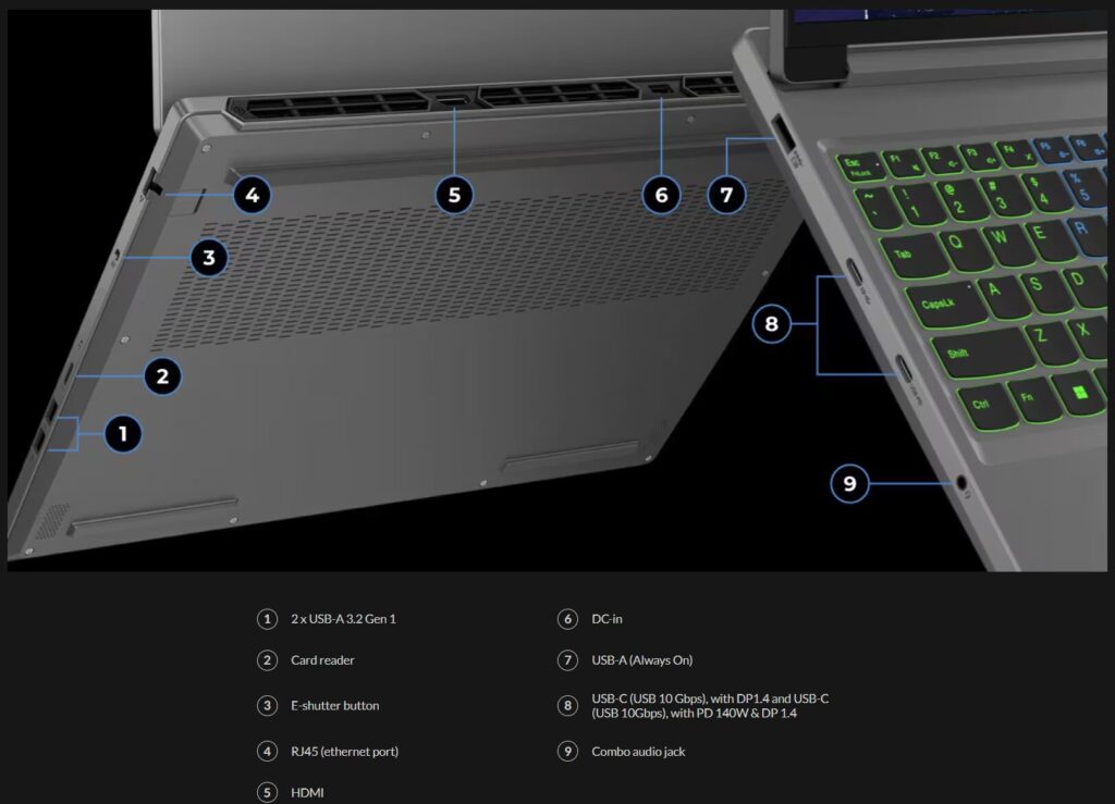 The Legion 5i includes a generous array of ports to enhance connectivity: three USB Type-A, two USB Type-C (with power delivery), a 3.5mm audio combo jack, and a 3-in-1 microSD Card reader.