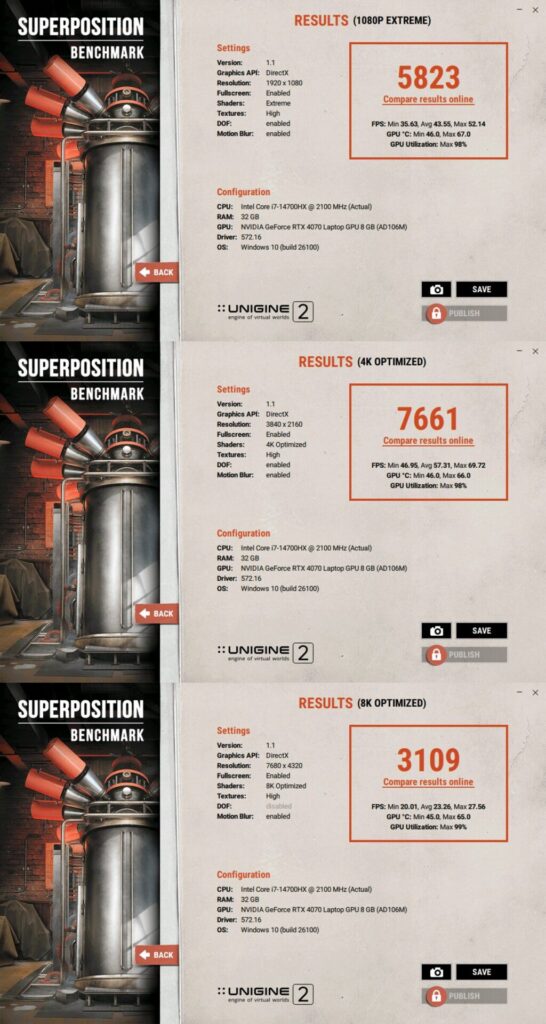 In the Unigine Superposition Benchmark using “8k Optimized,” “4k Optimized,” and “1080p Extreme” graphic settings, the RTX 4070 GPU operated at capacities ranging from 98% to 99% with average frames per second (FPS) clocking in at 23.26 for 8k, 57.31 for 4k, and 43.55 for 1080p Extreme.