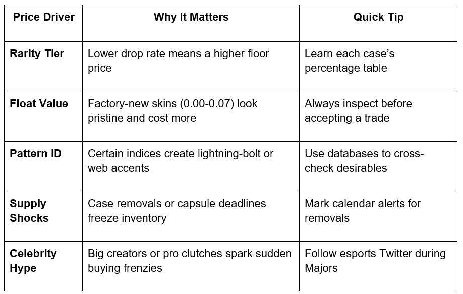 Economics in CS2 is not a mysterious algorithm; it is simply ordinary supply amplified by emotion. Limited-run cases give each drop a sense of scarcity, whereas streamers can pump an item simply by pulling it on camera. When Valve vaults a case, supply freezes overnight and charts rocket skyward. Conversely, a rapid surge of duped items can tank values in hours. You can’t foresee every swing, but you can read the forecast.