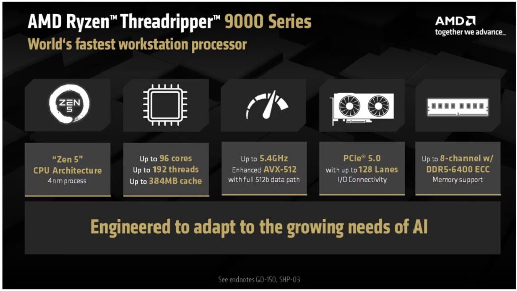 Engineered to adapt to the growing needs of AI with up to 96 “Zen 5” CPU cores, enhanced AVX-512 support, 8-channel DDR5-6400 memory and PCIe 5.0 connectivity for the latest high-end GPUs, this new generation of Threadripper Pro is the world’s fastest workstation processor.