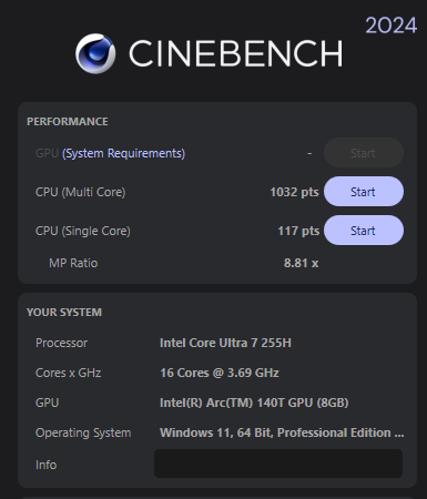The NUC 15 Pro is powered by the latest Intel Core Ultra 7 255H processor, coupled with the integrated Intel Arc 140T GPU. This cutting-edge chip not only delivers remarkable performance benchmarks — 117 single core and 1,032 multi-core points in Cinebench 2024 — but also excels in real-world applications.