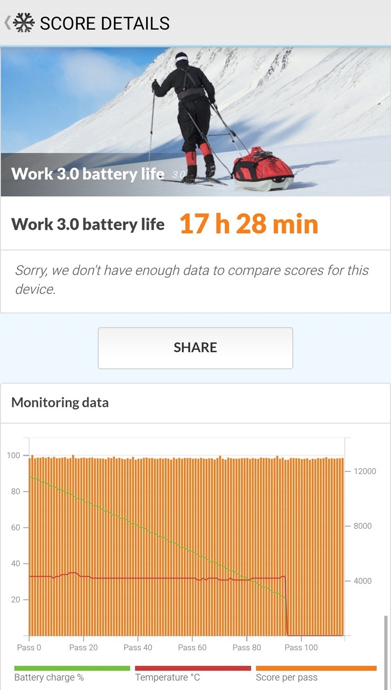 Battery life tests conducted using PC Mark Work 3.0 indicate a runtime of 17 hours and 28 minutes, from a full charge down to 20%.