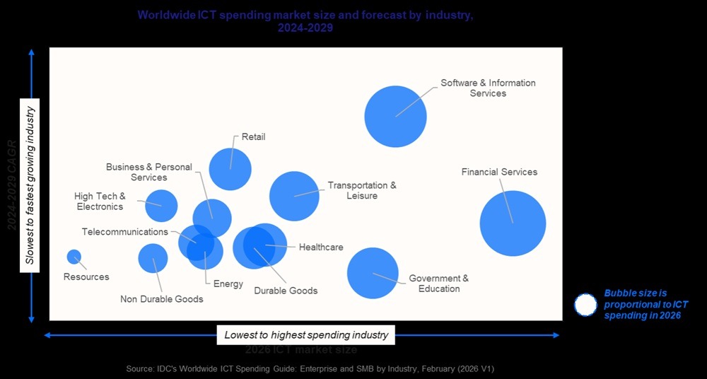 By industry, software and information services, banking, and retail are expected to account for the largest share of ICT spending in 2026, collectively surpassing $1 trillion.