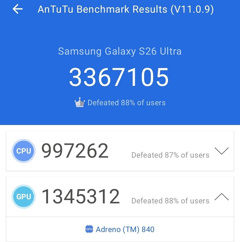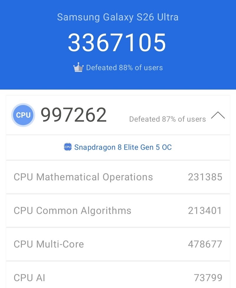At the core of the Galaxy S26 Ultra is the Snapdragon 8 Elite Gen 5 processor, specially tailored for Galaxy devices. It scored a 3,667 single-core score, and 11,083 multi-core score with Geekbench 6, and 997,262 CPU score with AnTuTu Benchmark. This translates to exceptional power for demanding applications.