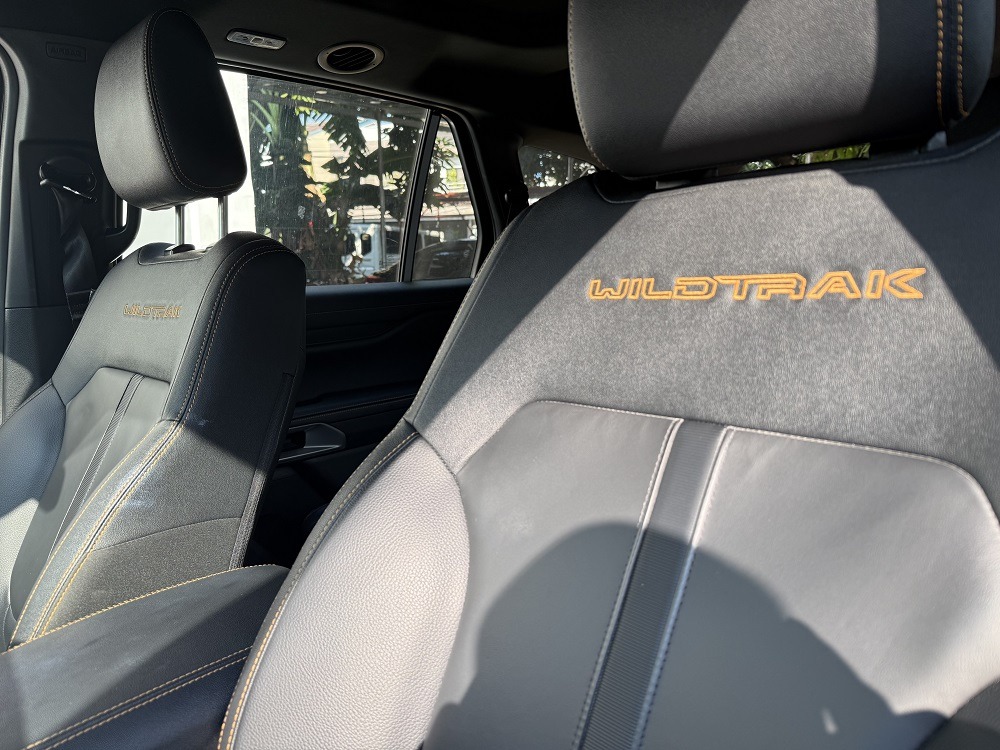 Inside, the Everest Wildtrak distinguishes itself with orange stitching on its seats, a large SYNC 4A touchscreen, and a clean digital instrument cluster. It leans more toward a lifestyle vehicle than a purely utilitarian SUV.