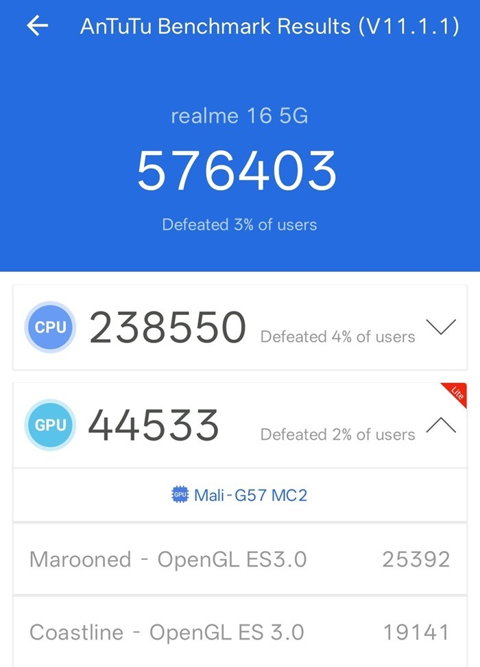 The realme 16 5G is powered by the MediaTek Dimensity 6400 Turbo processor paired with a Mali-G57 MC2 integrated GPU. This combination provides a smooth and lag-free experience for multitasking and casual content consumption.