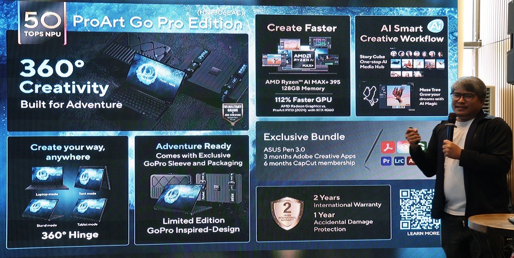 A limited ProArt GoPro Edition, developed in partnership with GoPro, targets creators working in mobile or outdoor environments. The convertible device includes integrations such as StoryCube and GoPro Player, along with a dedicated hotkey for faster access to editing tools. It is priced at P209,995.