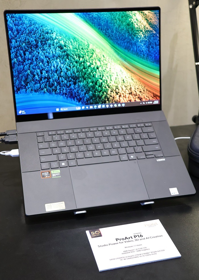 The flagship ProArt P16 is designed for video professionals, supporting 10-bit 4:2:2 color workflows and multi-track editing in 4K and 8K formats. It runs on an AMD Ryzen AI 9 HX370 processor with a dedicated neural processing unit and features an OLED display for color accuracy. The unit is priced at P289,995.